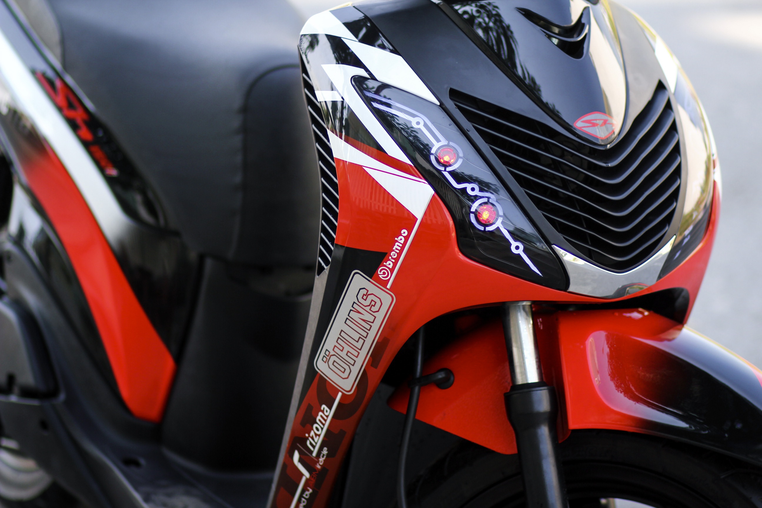 Chiếc SH 2010 nhập Italy, nguyên bản màu đỏ. Model này được làm mới bằng cách sơn tem đấu dàn áo, sơn tĩnh điện một số chi tiết, phủ pha lê chóa đèn và thay ốp pô của SH 300i.