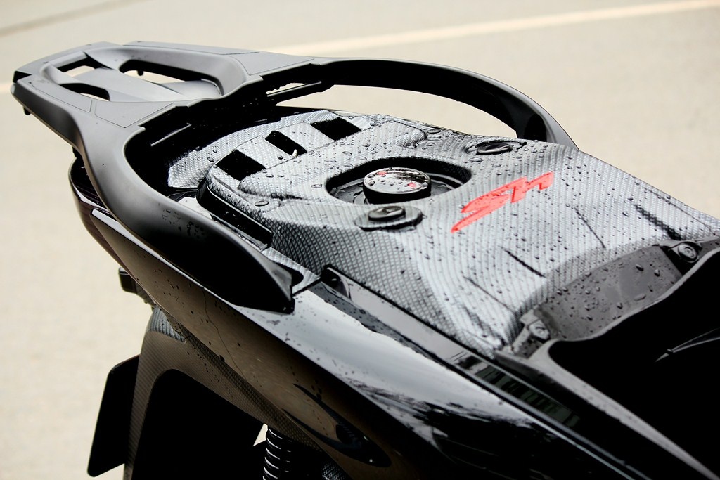 | Toàn bộ dàn nhựa nhám của xe, bao gồm cả phần dè con và nắp đậy cốp xe, đều được sơn phủ carbon khiến tổng thể xe sang trọng, nam tính. |