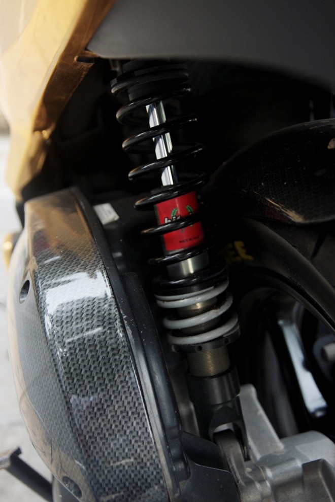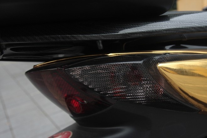 Ngoài thay đổi màu xe, các chi tiết độ khác vẫn giữ nguyên như ở bản độ chrome vàng như tay nắm dán giả carbon.