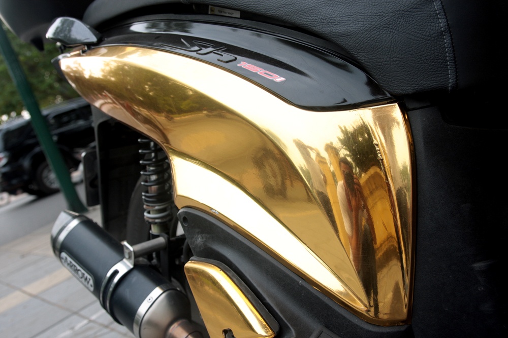 | Theo chia sẻ của chủ nhân, chiếc SH 2011 nguyên bản màu đen, sản xuất trong nước chỉ vừa được thay dàn áo chrome vàng hồi tháng 6 vừa qua, lấy ý tưởng từ những siêu xe mạ chrome vàng sáng bóng của các đại gia ở Trung Đông. |