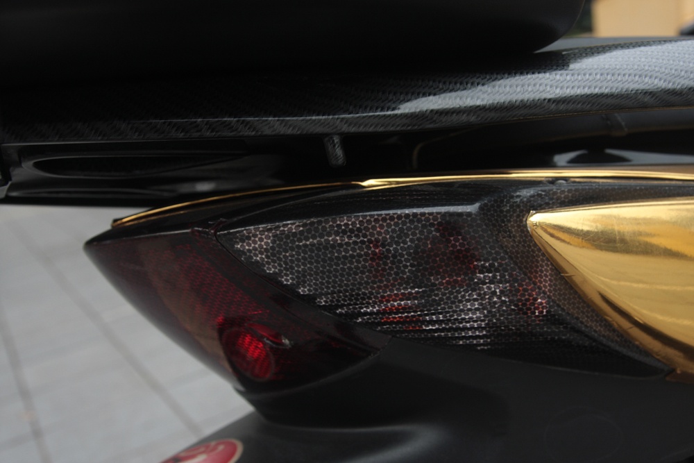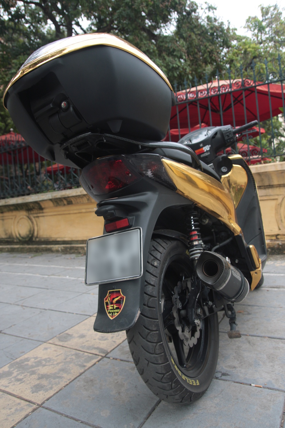 | Thùng đựng đồ gắn thêm phía sau cũng được dán decal chrome vàng. |