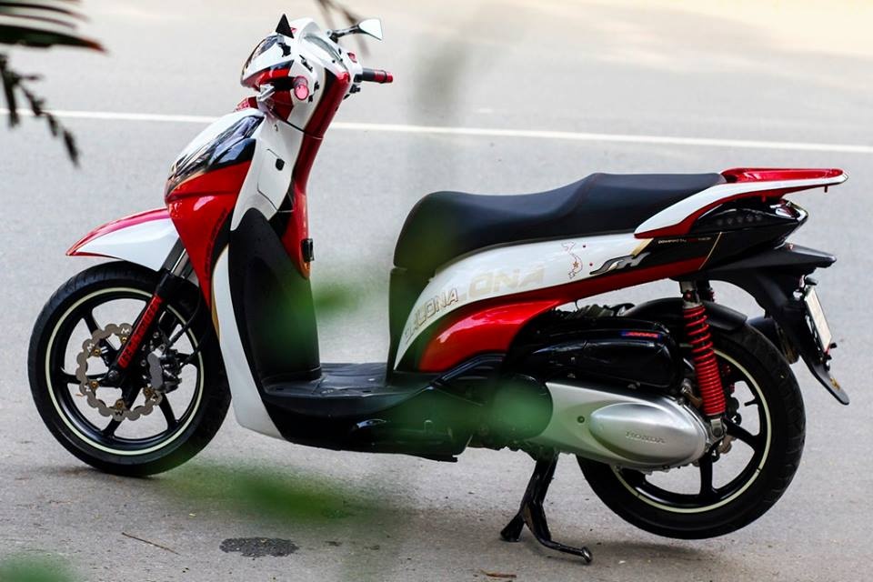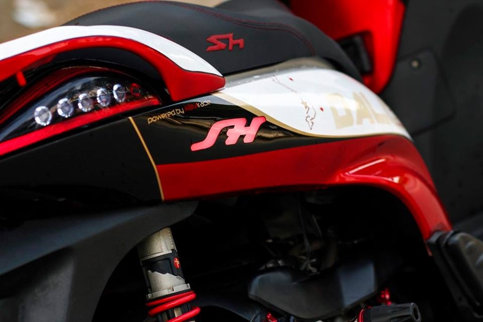 | Chiếc Honda SH300i đời cũ của biker Sài Gòn ban đầu độ dàn áo với tem đấu Monster, tuy nhiên, sau đó chủ nhân của nó quyết định lên phong cách mới với hai màu đỏ - trắng chủ đạo cùng tem mang bản đồ Việt Nam. |