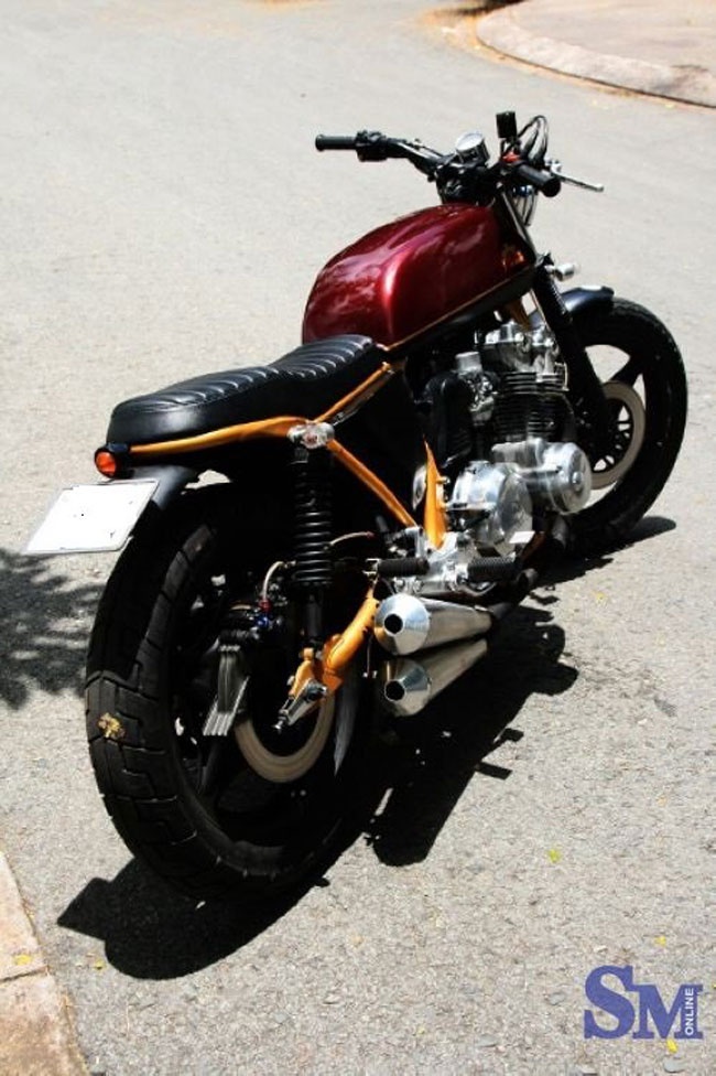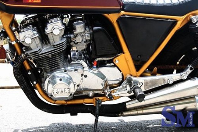 | “Thoát xác” thành phiên bản Street Tracker, chiếc Honda CB750F sử dụng động cơ DOHC, dung tích 748 phân khối, làm mát bằng không khí, 4 máy thẳng hàng, 4 van trên mỗi xi-lanh, công suất tối đa 78 mã lực/9.000 vòng/phút, kết hợp hệ truyền động xích tải và hộp số 5 cấp, giúp xe tăng tốc trên phố Sài thành, kèm theo âm thanh rền từ dàn 4 ống pô. |
