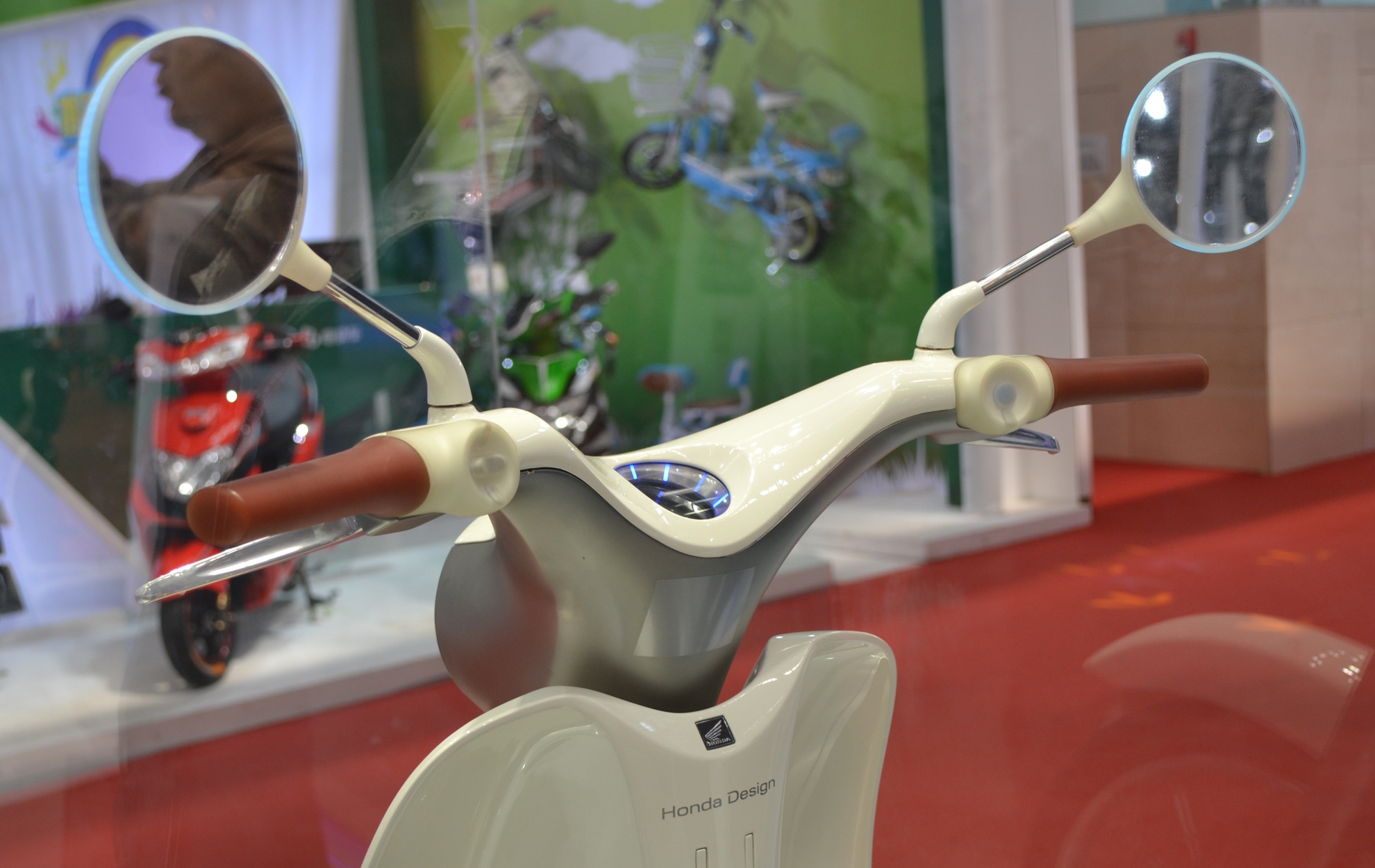 Phần tay lái của EV-Cub thiết kế trơn tru nhô cao hai bên trong khi một cụm đồng hồ trung tâm lõm sâu.