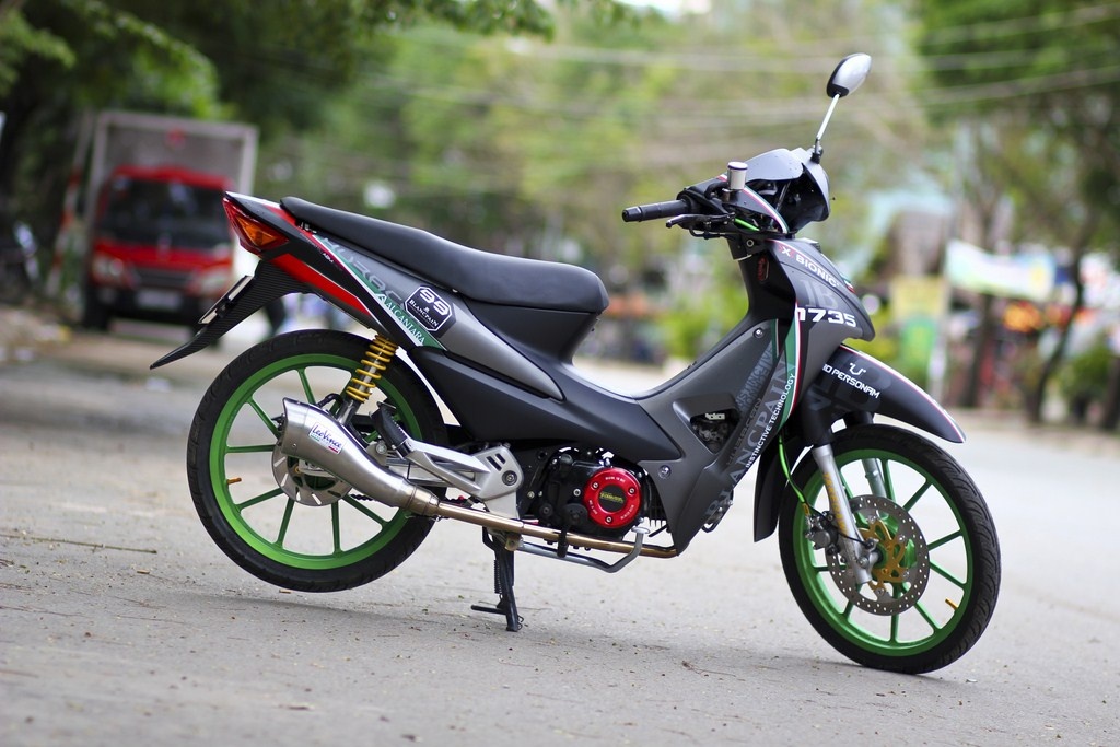 Chiếc xe số được sơn tem đấu và lên một số đồ chơi như mâm Daytona, đồng hồ RX2, cùm thắng, bao tay, gù, bình dầu Rizoma.