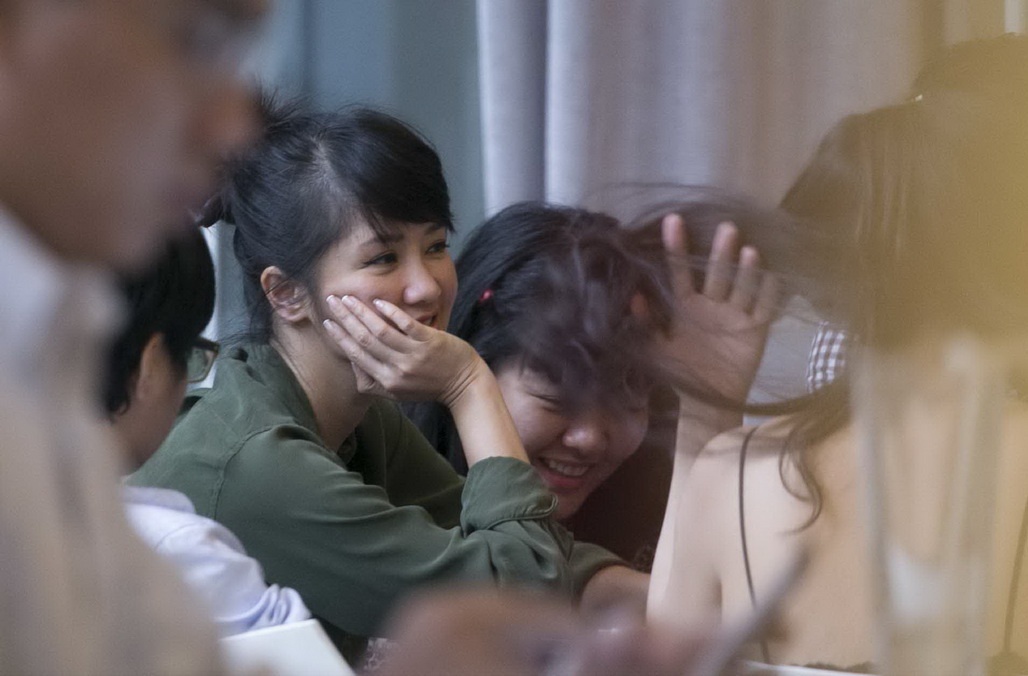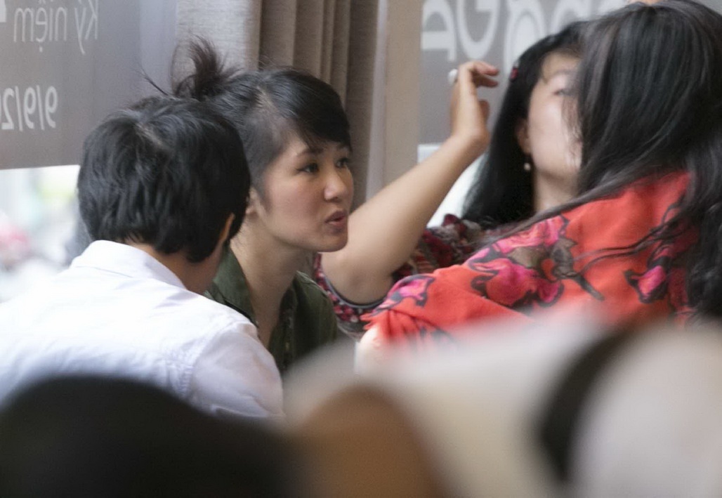| Ngồi lọt thỏm giữa các học trò cưng, nữ ca sĩ lắng nghe thắc mắc của từng người và dành thời gian thảo luận nhóm. |