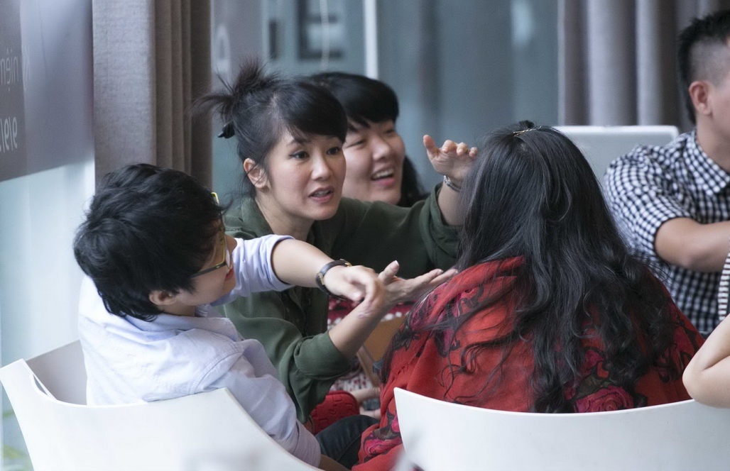 | Không khí buổi trò chuyện rất vui vẻ và thoải mái. Hồng Nhung không chỉ là người thầy mà còn là người chị gái dễ gần đối với các thí sinh trong đội. Cô thường xuyên chia sẻ và dùng cả tay để mô tả cụ thể hơn cho lời nói của mình. |
