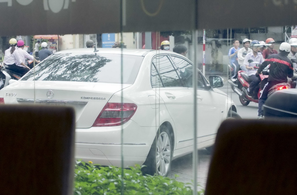 | Hồng Nhung đi lại bằng Mecerdes C200 màu trắng mới tinh, sang trọng. |