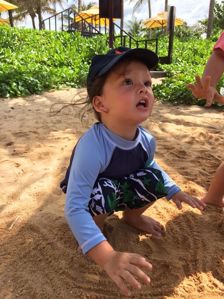 | Bức ảnh hồn nhiên và đáng yêu của bé Aiden. Mẹ Hồng Nhung bình luận: "Em là em bé nhà quê, biết ngồi xổm từ nhỏ đấy". Trước đó, diva cũng chia sẻ: "Tôm hiền lắm, từ ngày nào tới giờ chỉ thích ăn cơm với muối vừng. Vậy mà sức đâu ra em chạy nhảy, hát ca cả ngày. Mẹ yêu em". Cũng giống như Lea, hot boy của Hồng Nhung sở hữu những nét rất tây và vô cùng đáng yêu. |