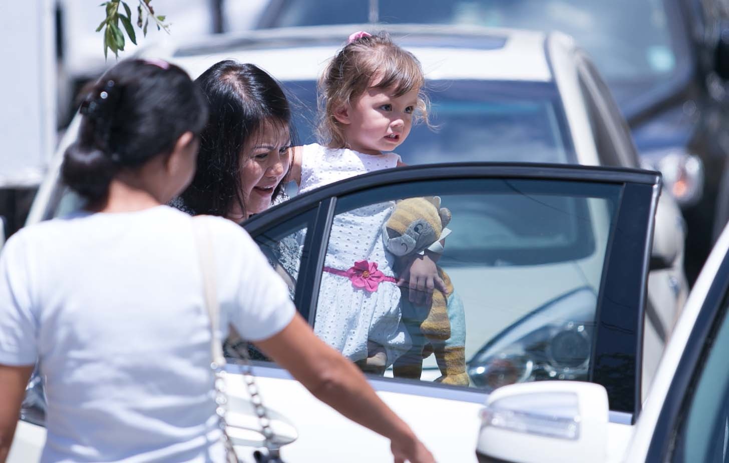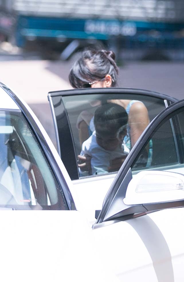 | Hồng Nhung bế Aiden lên xe, cả nhà nhanh chóng rời đi. |