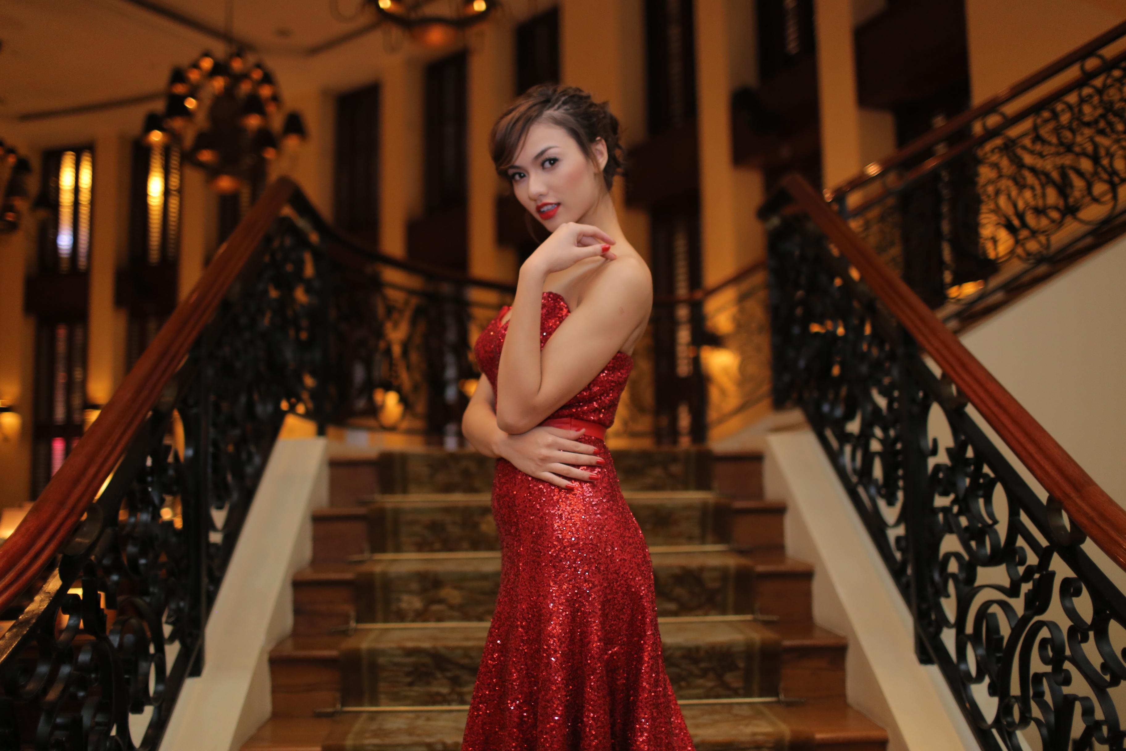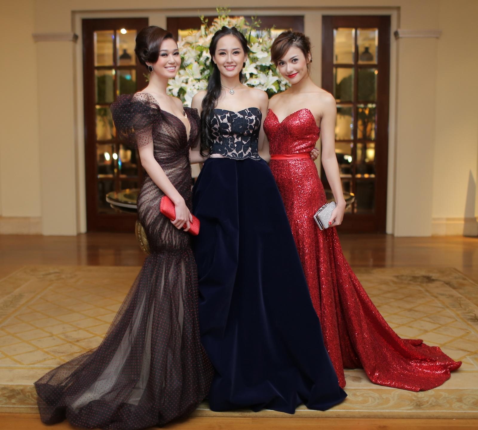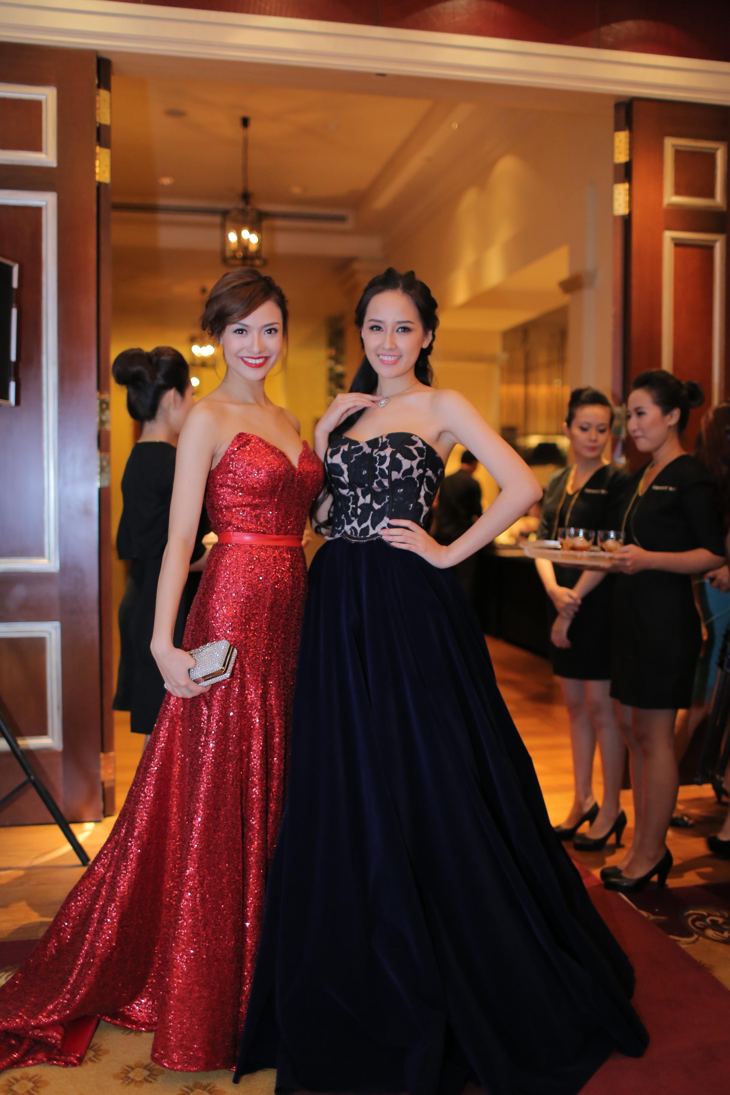 | Nếu Hồng Quế để lại ấn tượng với bộ đầm đỏ nổi bật, Mai Phương Thúy lại đằm thắm, dịu dàng hơn với bộ cánh màu xanh nhung. |