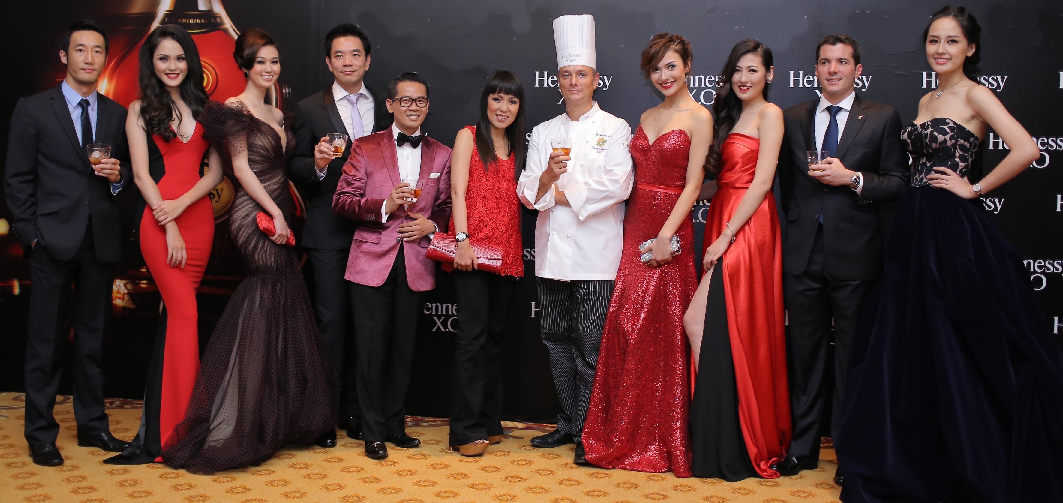 | Các người đẹp chụp ảnh kỷ niệm bênông Benny Ng - Giám đốc điều hành Moёt Hennessy Việt Nam, nhà thiết kế Quách Thái Công, bếp trưởng lâu đài Bagnolet - David Fransoret. |
