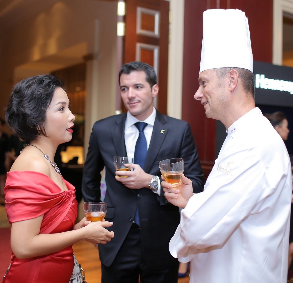 | Ca sĩ Mỹ Linh cũng xuất hiện tại buổi tiệc. Cô trò chuyện cùng đầu bếp nổi tiếng người Pháp David Fransoret đến Việt Nam tham dự chương trình Hennessy Appreciation Grows lần thứ 3. |