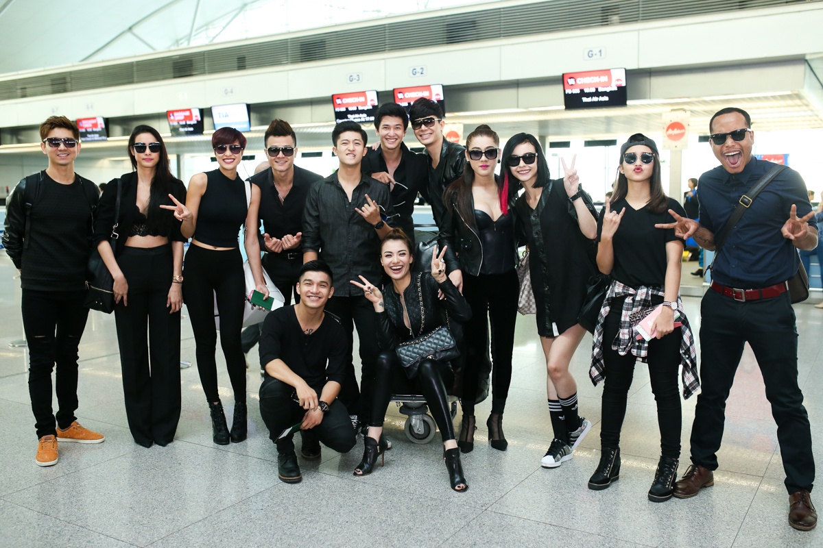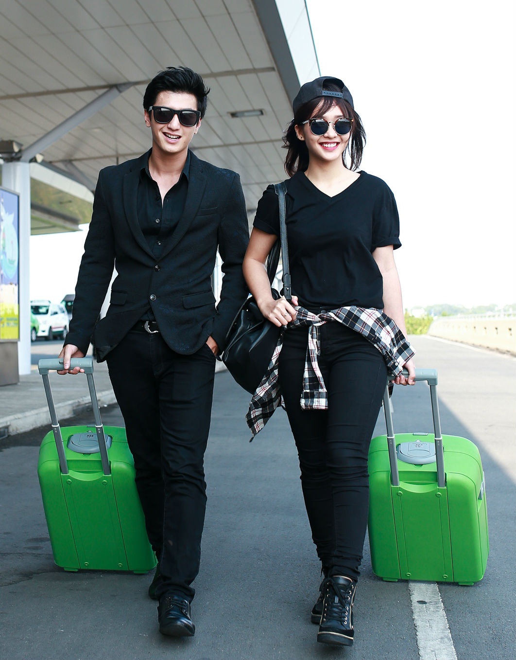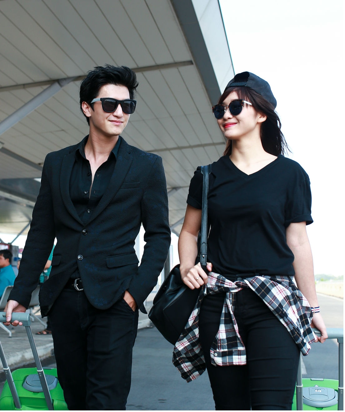 Cả hai diện đồ ton sur ton màu đen, cùng dàn sao Việt gồm ca sĩ Tim, người mẫu Vĩnh Thụy, Nathan Lee, Phương Mai... lên đường sang Thái Lan ghi hình cho gameshow mới.