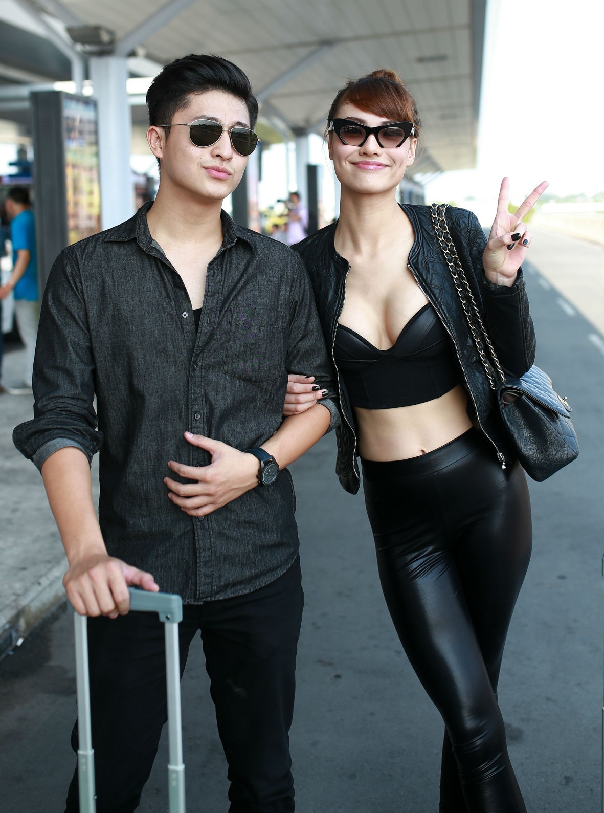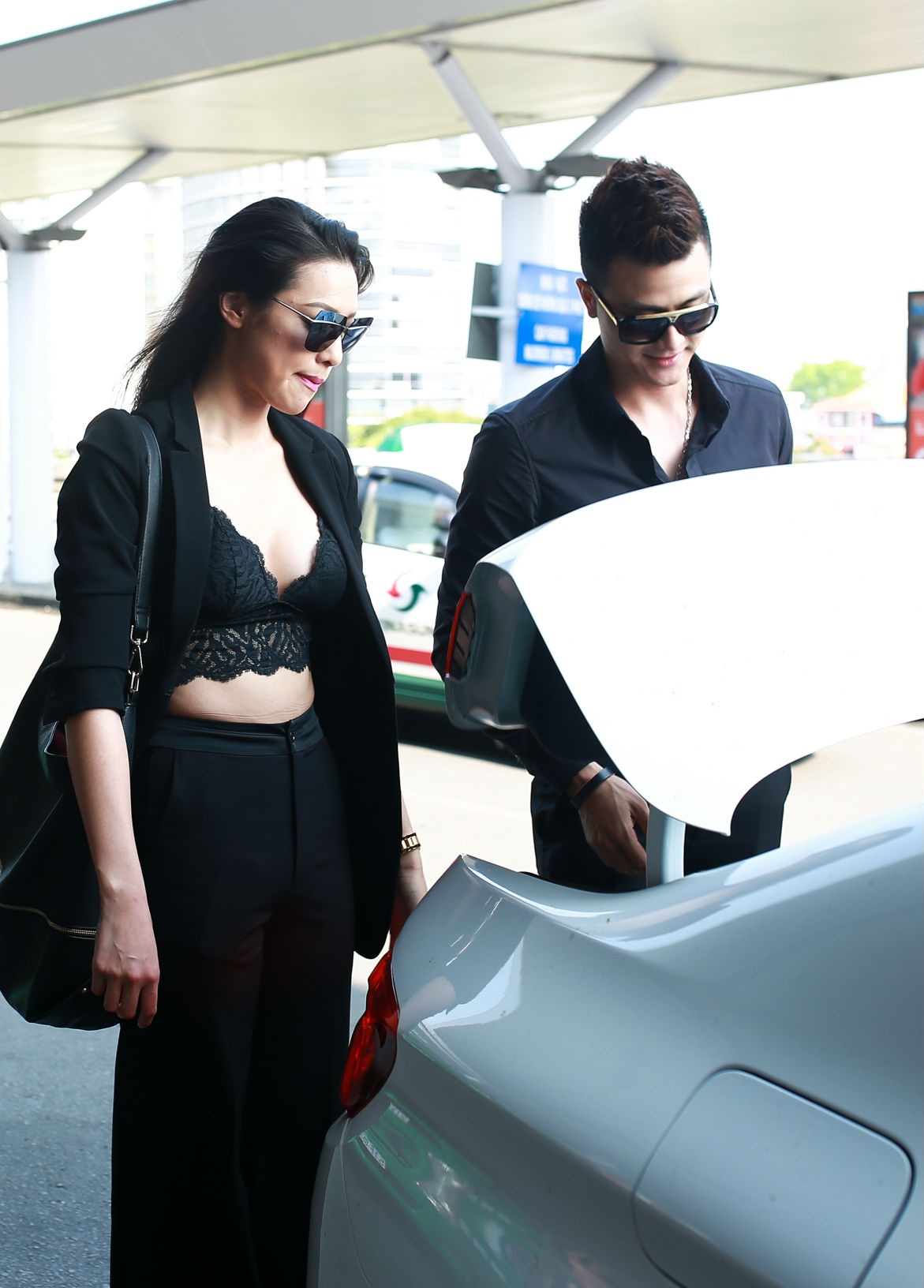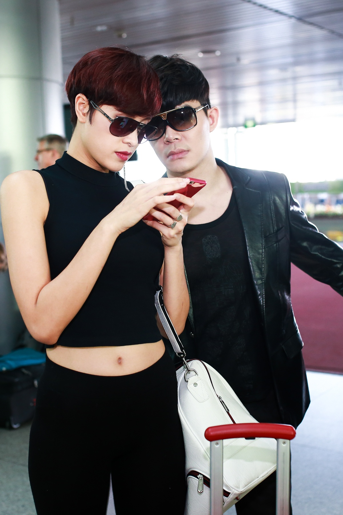 Cả hai diện đồ ton sur ton màu đen, cùng dàn sao Việt gồm ca sĩ Tim, người mẫu Vĩnh Thụy, Nathan Lee, Phương Mai... lên đường sang Thái Lan ghi hình cho gameshow mới.