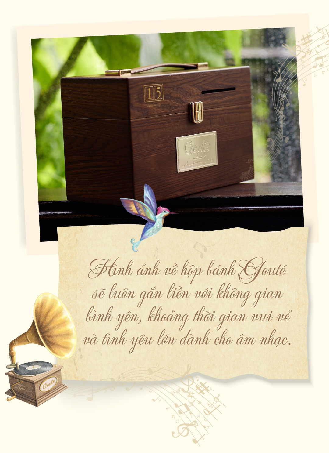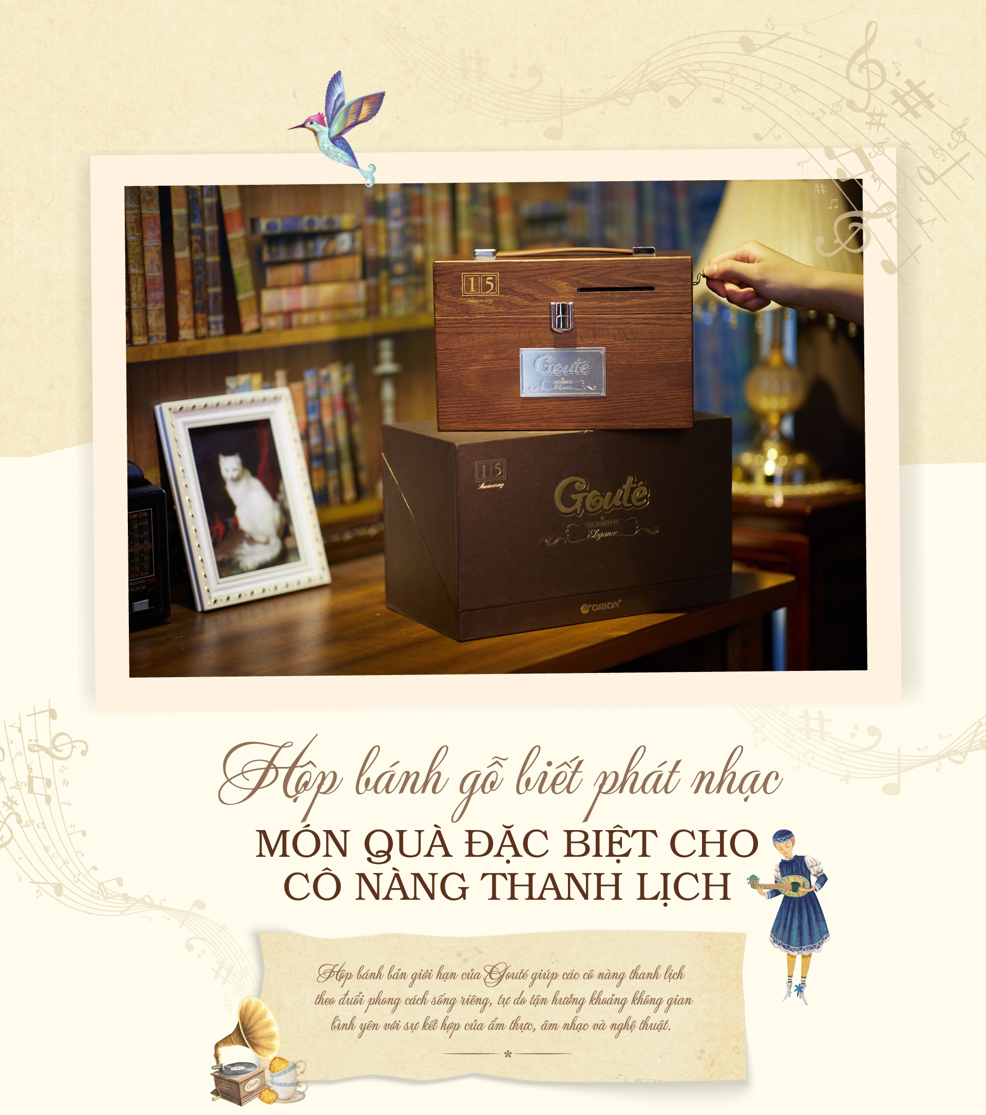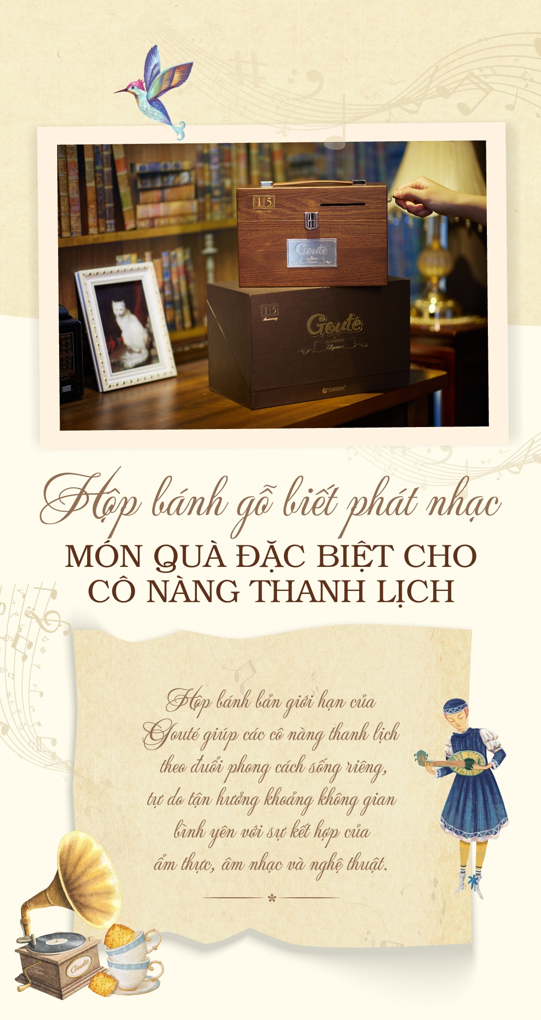 Nhân dịp 15 năm có mặt tại Việt Nam, Gouté ra mắt hộp quà phiên bản giới hạn được thiết kế độc quyền cho những ai yêu thích tinh thần, triết lý và chất lượng của thương hiệu. Thông điệp “Hộp nhạc gỗ thanh âm kỳ diệu - lan tỏa niềm vui sống và đam mê” là sự tổng hòa từ hương vị khó quên của bánh quy Gouté, hình ảnh cô gái Pháp thanh lịch và thanh âm êm dịu từ những giai điệu diệu kỳ.