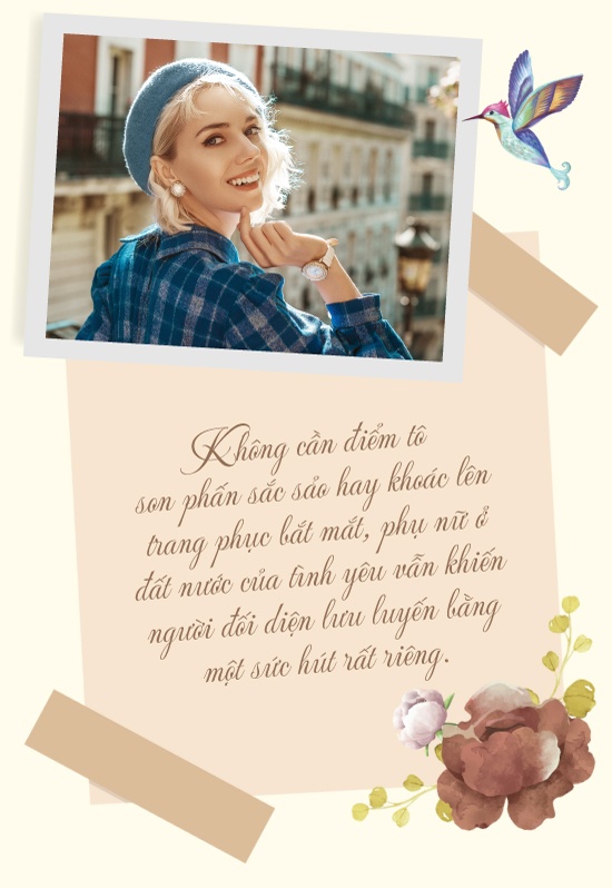 Không cần điểm tô son phấn sắc sảo hay khoác lên trang phục bắt mắt, phụ nữ ở đất nước của tình yêu vẫn khiến người đối diện lưu luyến bằng một sức hút rất riêng. Điều đó toát lên từ khí chất thanh cao, phong thái trang nhã, vẻ duyên dáng lạ kỳ trong từng cử chỉ.