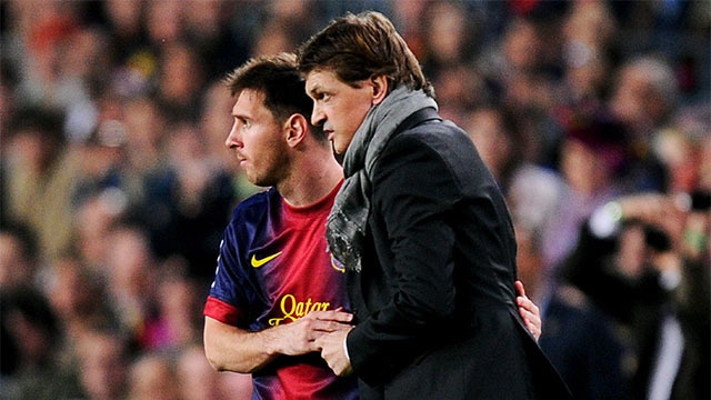 | Cố HLV Tito Vilanova là người theo sát và thường xuyên động viên Messi. Ảnh: Marca. |