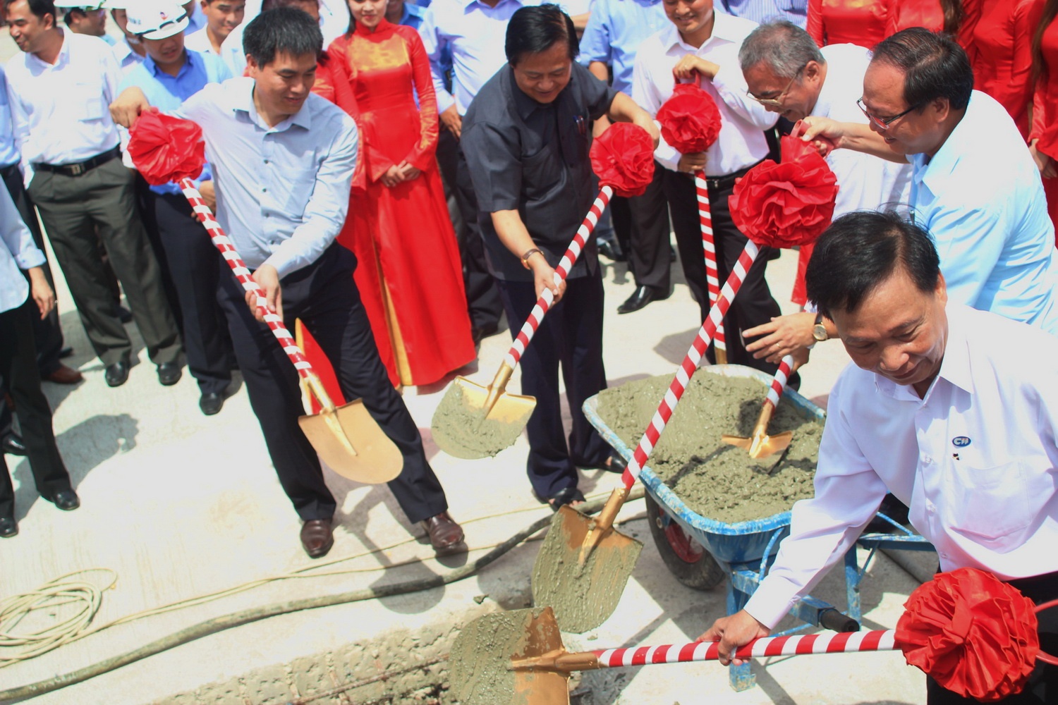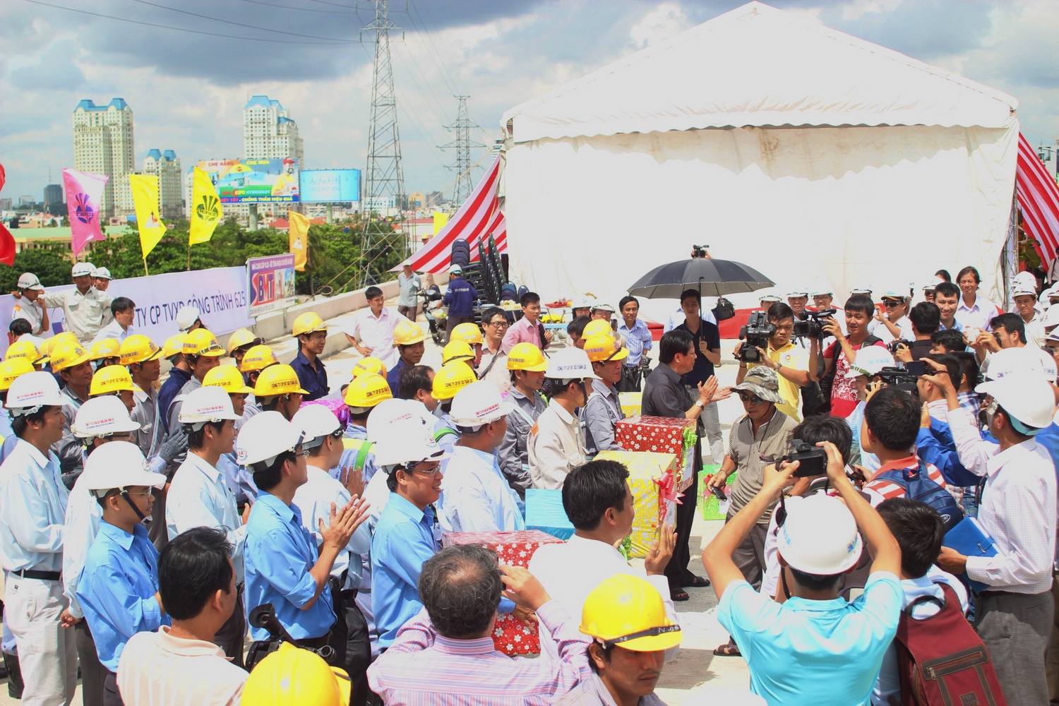 | Lãnh đạo TP.HCM và đơn vị thi công làm lễ hợp long. |