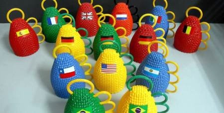 Những công cụ cổ vũ cho đội yêu thích như chiếc kèn Caxirola của các fan là không thể thiếu. Được bán với giá 50.000 đồng/chiếc, kèn Caxirola có nhiều màu sắc nổi bật khác nhau. Đây là loại nhạc cụ được làm từ chất liệu nhựa tái chế phỏng theo một loại nhạc cụ ở châu Phi. Nó bao gồm các ống nhựa nhỏ được đan vào nhau tạo thành hình rổ kín, khi lắc các hạt khô bên trong va vào nhau tạo ra âm thanh khá thú vị. Nhạc cụ này được làm ra để mang vào sân vận động, giống như chiếc kèn Vuvuzela tại Nam Phi năm 2010. |