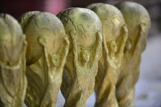Các dịch vụ bán biểu tượng World Cup cũng đang sôi động trên thị trường. Tại xã Bát Tràng, Gia Lâm, anh Vương Hồng Nhật cùng vợ là chị Nguyễn Thị Nga mấy ngày nay mải miết đẽo gọt những lô hàng Cup vàng để kịp giao cho khách. Trong mấy ngày đầu sản xuất, gia đình đã xuất đi 500 chiếc. "Hiện có nhiều đơn đặt hàng, có lẽ tôi phải thuê thêm thợ để kịp tiến độ", anh nói. |