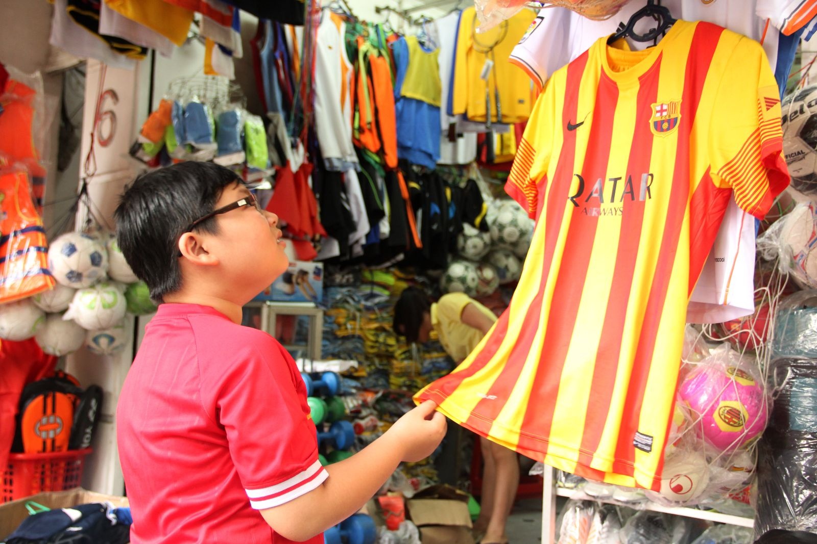 Áo Ronaldo, Messi giá 130.000 đồng cũng đang là mốt trong những ngày này. Hiện tại các cửa hàng thời trang World Cup đắt khách nhất là áo mang số hiệu, trang phục thi đấu của các cầu thủ nổi tiếng như Ronaldo, Messi, Neymar. |
