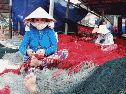 Cách nơi sửa tàu không xa, nhiều căn chòi tạm mọc lên làm nơi trú ngụ của những người làm nghề vá lưới. Tại đây, có rất nhiều phụ nữ vừa giăng cước vừa cười nói rôm rả. Chị Phạm Thị Hoa, Phạm Thị Tâm, xã Hòa Hiệp Bắc (huyện Đông Hòa, tỉnh Phú Yên) gồng mình khuân vác hơn nửa tạ lưới rồi cho biết: Đầu năm, thuyền cá ngừ ồ ạt cập bến, lưới hỏng hóc nhiều thế là mùa “ăn nên làm ra” của phụ nữ vá lưới có dịp bốc lên.