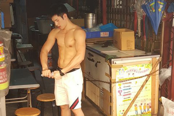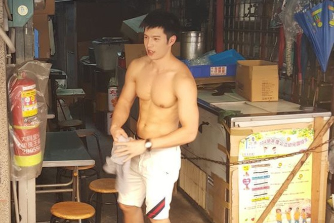 | Vì thời tiết ở Đài Loan khá nóng bức nên chiếc áo của anh ướt đẫm mồ hôi. Chàng trai này không ngần ngại cởi áo khoe vóc dáng chuẩn của mình. |