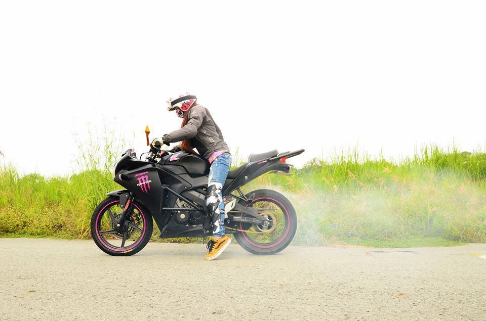 Với chiếc Honda CBR 150, cặp đôi thường rong ruổi trên các cung đường đi tour, khám phá những miền đất đẹp trên khắp cả nước. Khoảng nửa năm trở lại đây, một sở thích khác với chiếc xe côn tay của Trang khiến không ít đấng mày râu phải nể phục là thực hiện các kỹ thuật stunt như bốc đầu, drift tại những bãi đất trống.