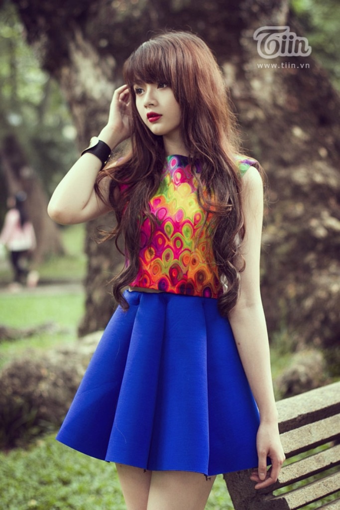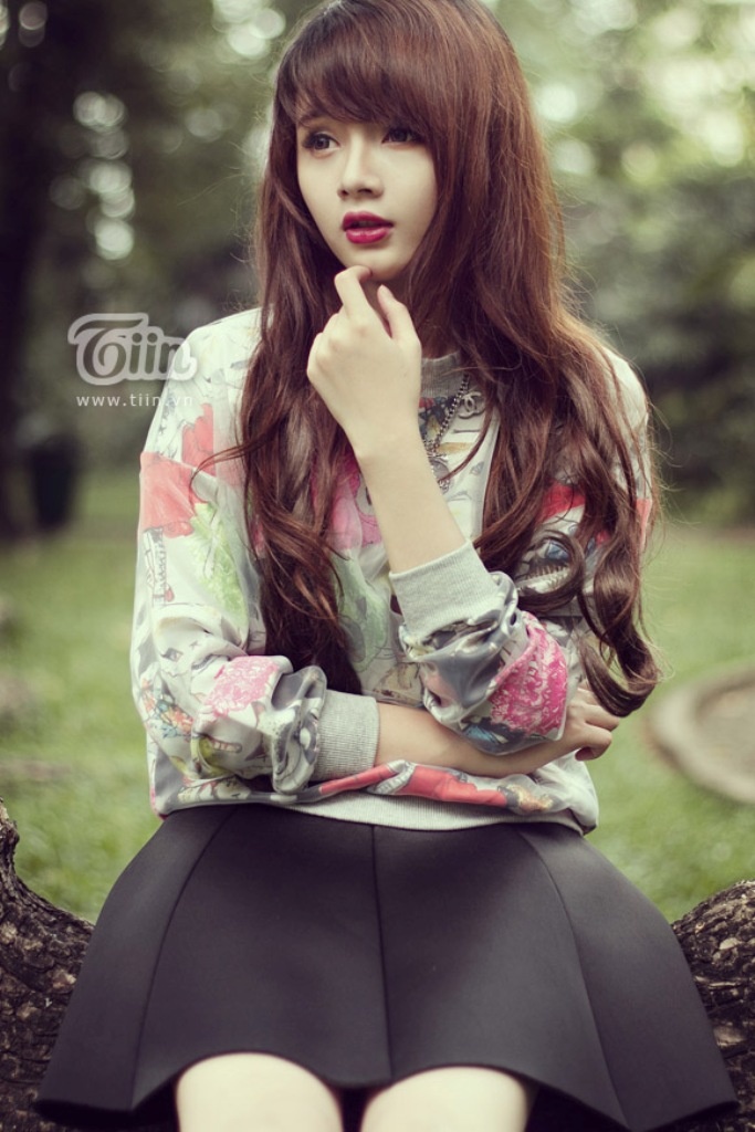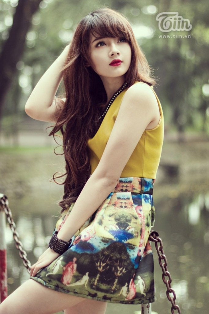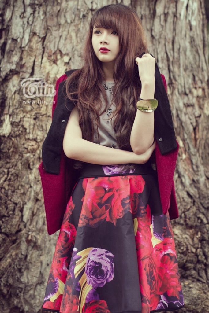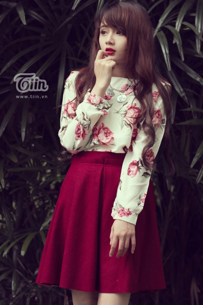 | Cô gái dịu dàng hơn trong chiếc váy đỏ sẫm. |