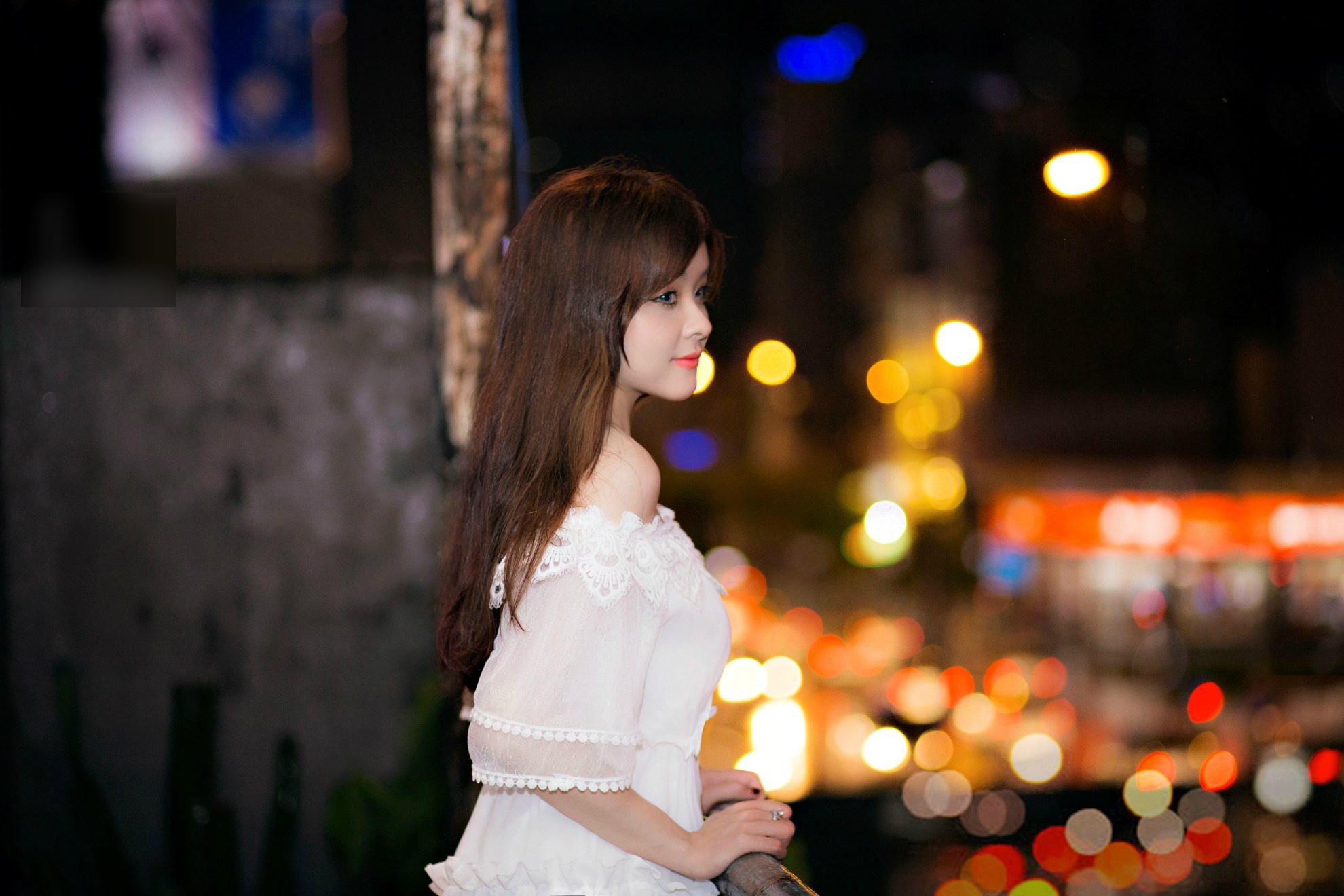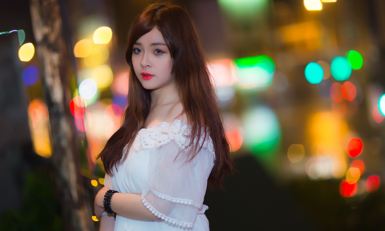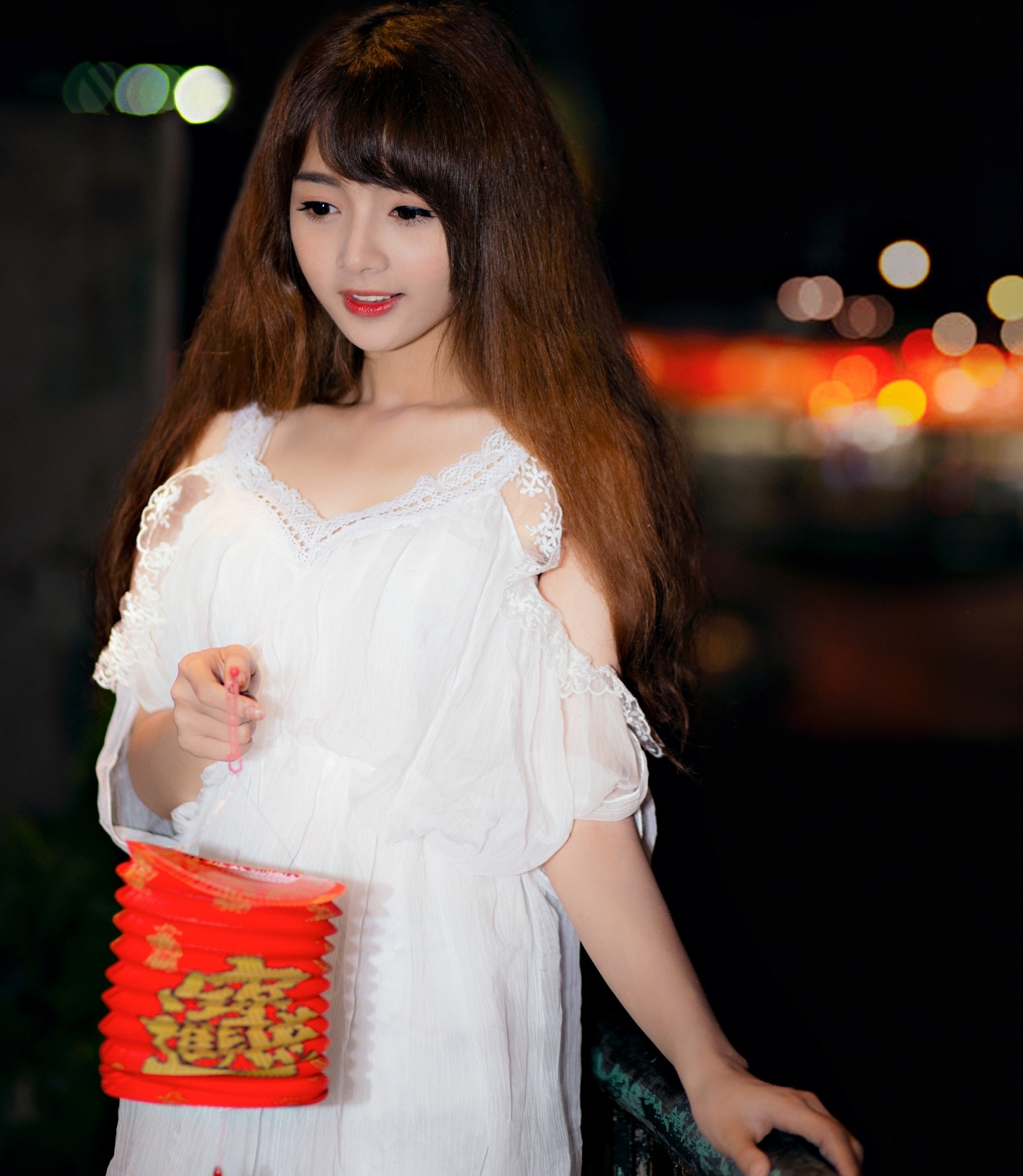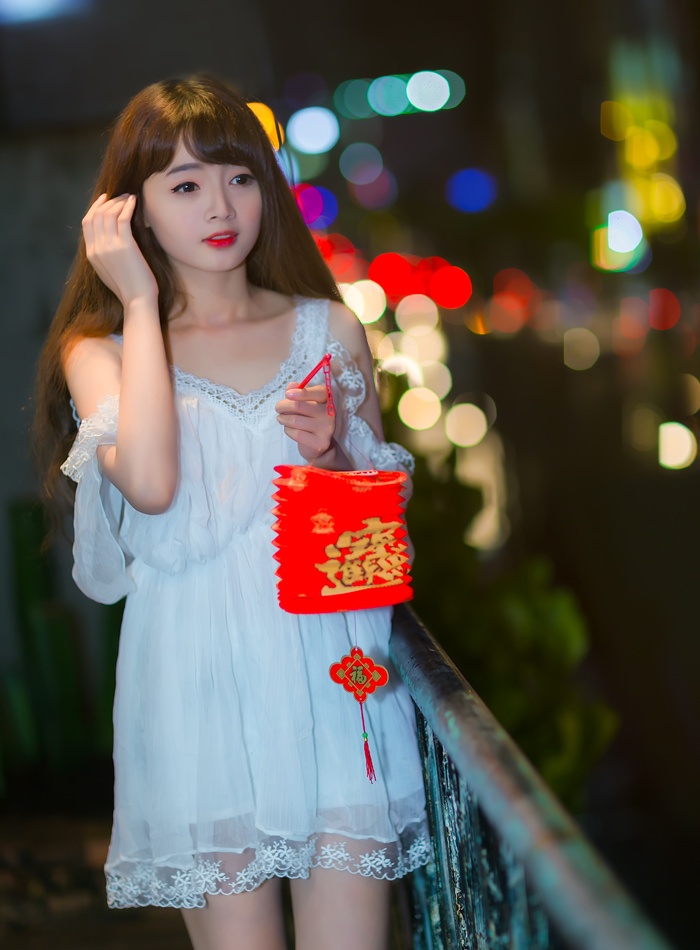 | Lan Hương gây ấn tượng với làn da trắng, gương mặt như búp bê. Cô diện váy trắng đơn giản cùng chiếc lồng đèn nhỏ trong không gian lung linh của Sài Gòn về đêm. |