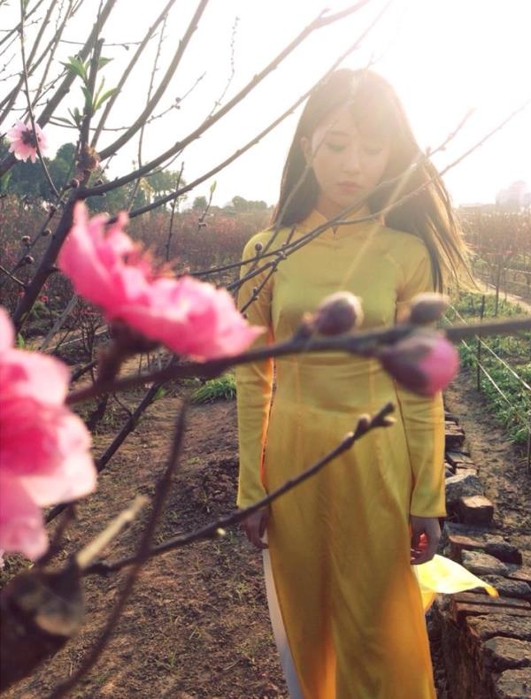 | Quỳnh Anh Shyn khoe ảnh áo dài ở vườn đào xuân khiến nhiều fan thích thú. |