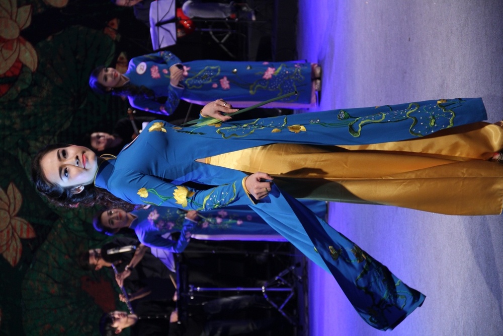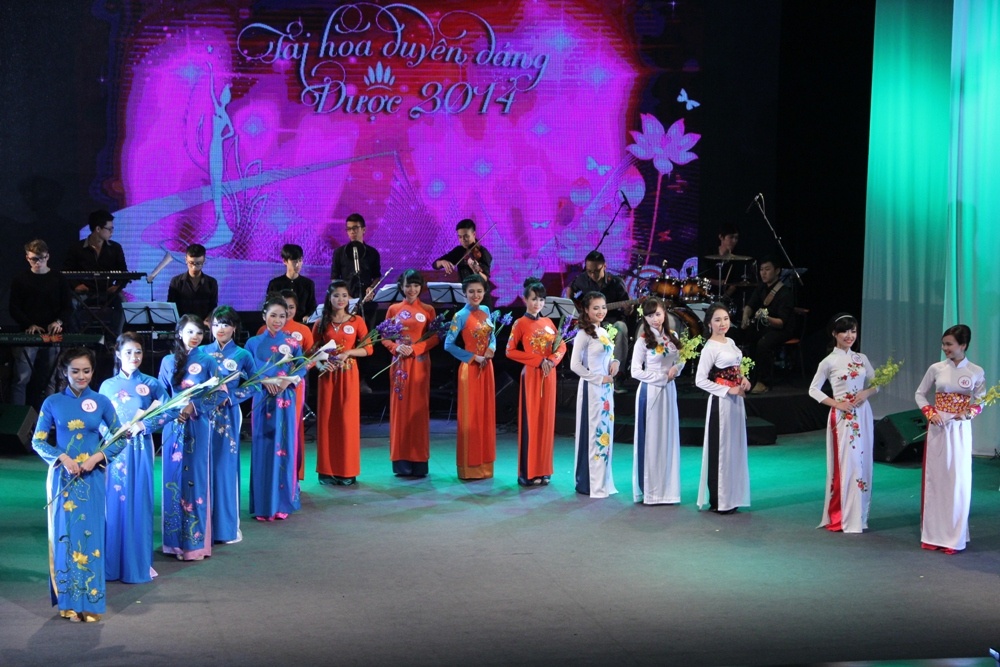 | Tối 8/11, tại Nhà hát Tuổi trẻ (Hà Nội), đêm chung kết Tài hoa duyên dáng Dược 2014 đã diễn ra với sự tranh tài của 15 nữ sinh xuất sắc nhất. Với vẻ ngoài xinh đẹp, nữ du học sinh Lào Ket Ke Son nhanh chóng thu hút sự chú ý của khán giả. Trong ảnh: Ket Ke Son tự tin trình diễn trang phục áo dài truyền thống của Việt Nam. |