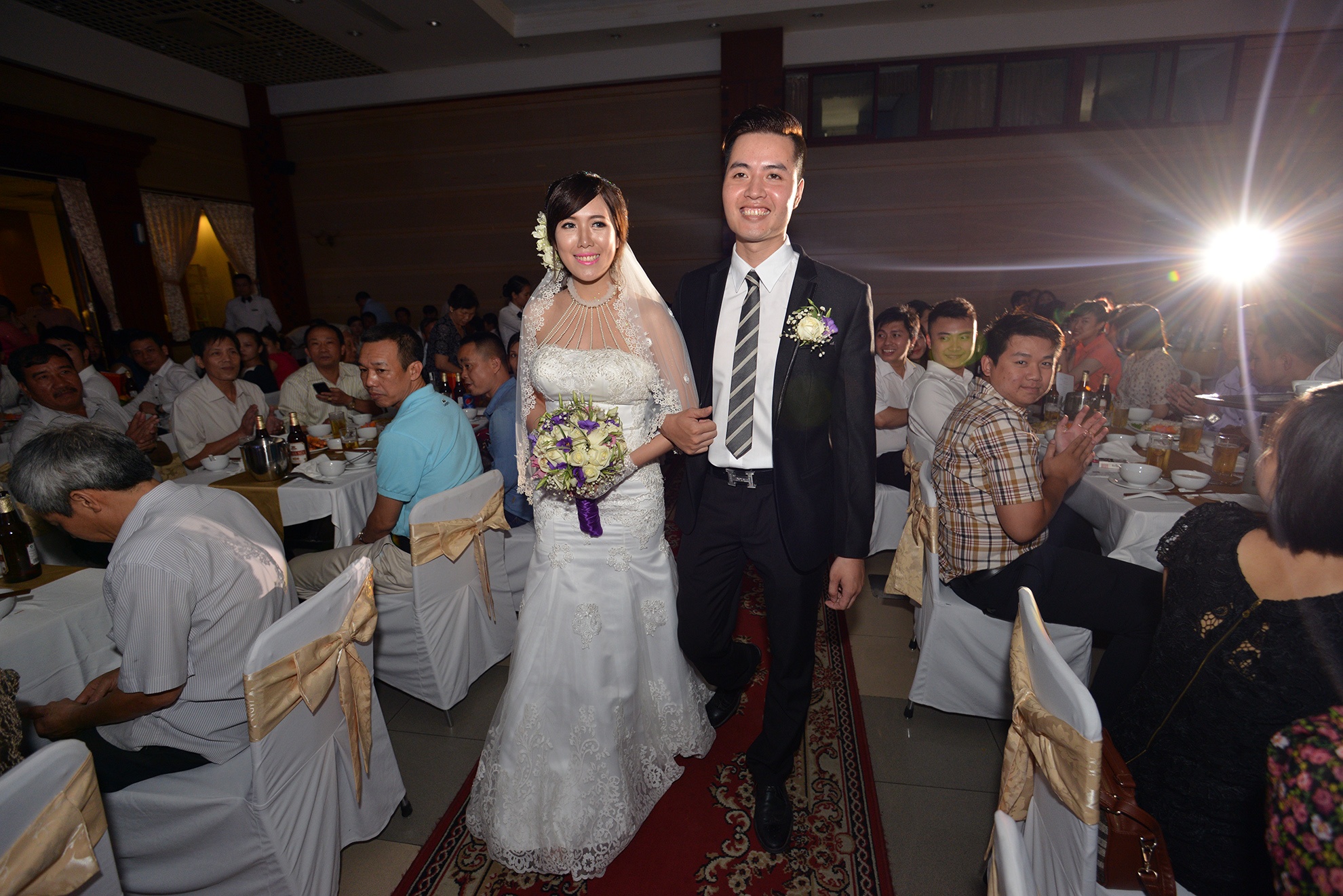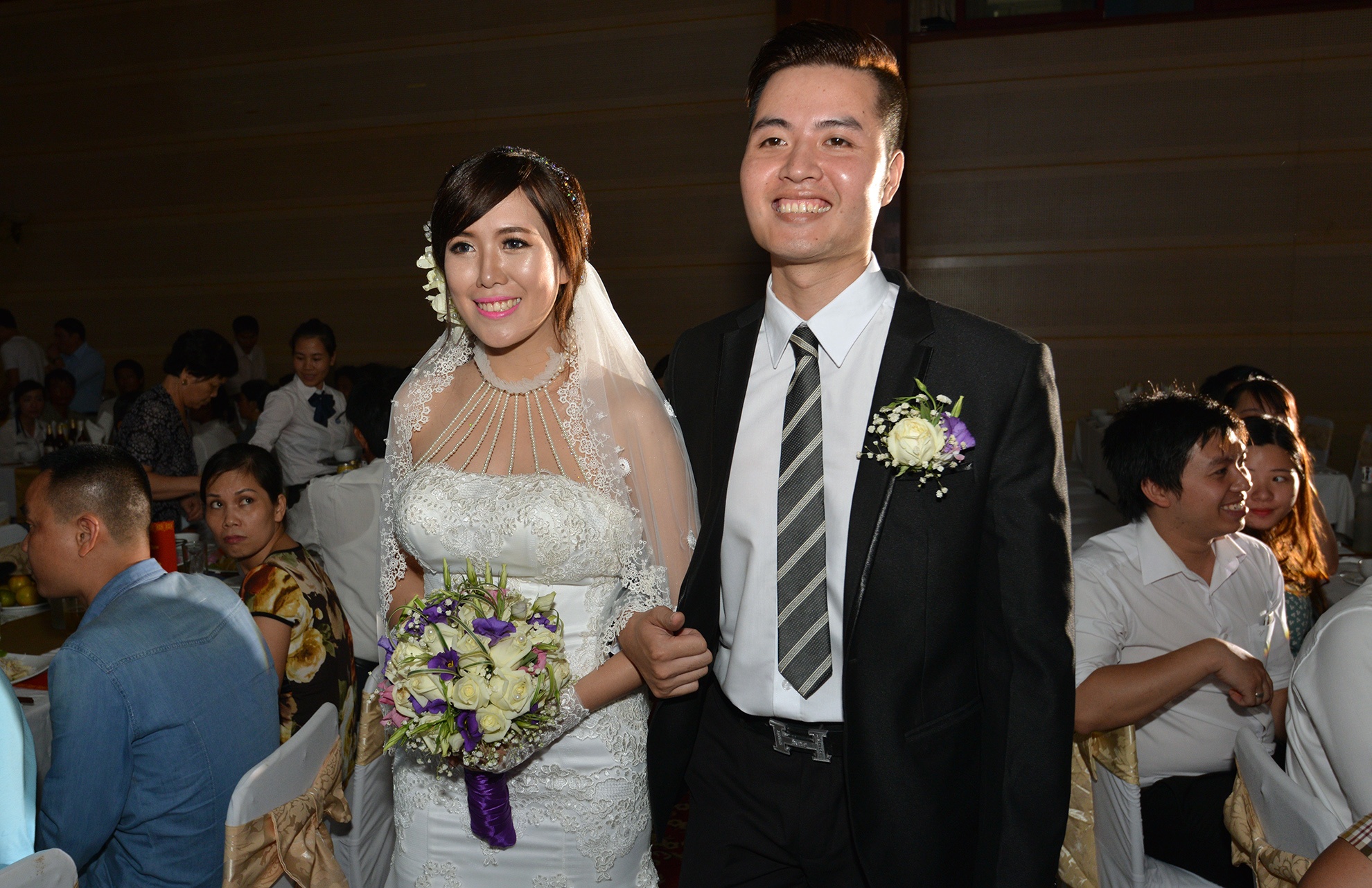 Đúng 11h, cả hai bước vào khán phòng trong sự chúc phúc của đông bảo bạn bè, người thân. Tiệc cưới trưa nay dành cho họ nhà trai. Buổi chiều, lễ cưới lại tiếp tục với họ nhà gái.