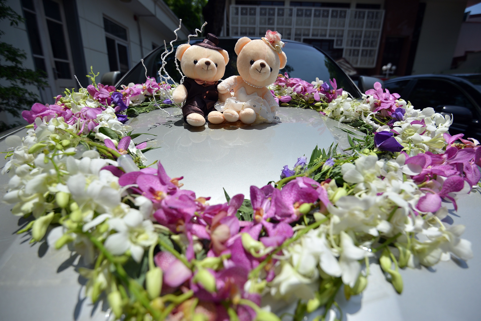 Chiếc xe dâu được trang trí vòng hoa hình trái tim với hình ảnh hai chú gấu ngộ nghĩnh đặt phía trong. Ngày mai (23/5), lễ rước dâu của cặp đôi này mới chính thức diễn ra.