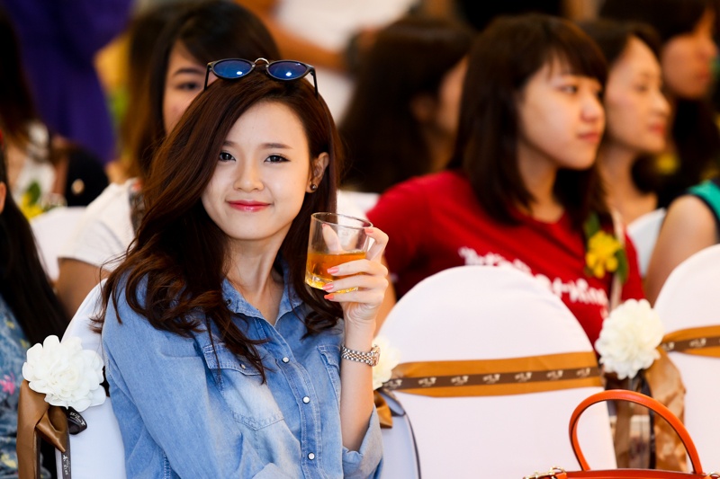 | Người đẹp tươi tắn chuẩn bị cho phần phát biểu của mình. |
