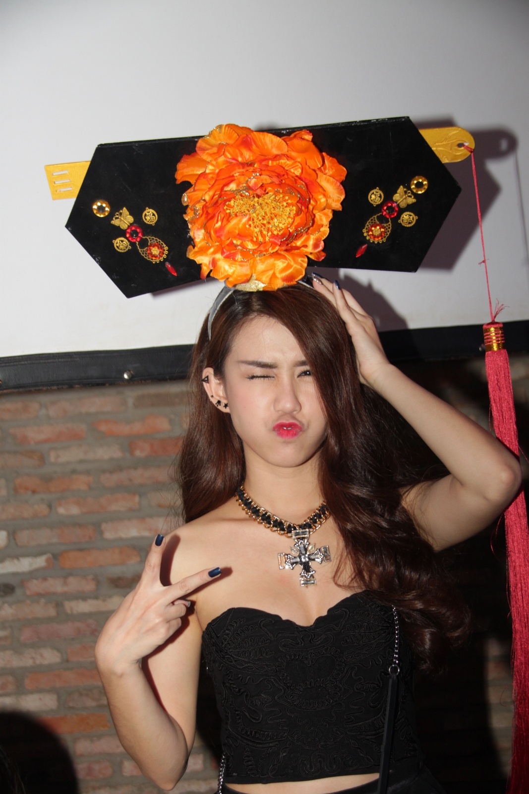 | Phía sau sân khấu, Ngọc Thảo thích thú đội chiếc mũ trong bộ phim Chầu Hoan Cua Chống nhái theo phim Hoàn Châu Công Chúa của nhóm DAMtv. |