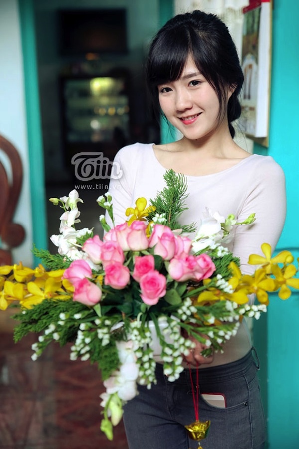 Kiều Trinh tự nhận mình chưa được khéo tay lắm nên mỗi lần cắm hoa là một lần cần đến sự trợ giúp của mẹ. Theo Trinh, lọ hoa càng nhiều màu sắc sẽ mang đến không khí xuân rộn ràng, tràn trề sức sống. Không chỉ trang trí được ở bàn ăn, lọ hoa còn có thể đặt ở phòng khách, phòng ngủ.