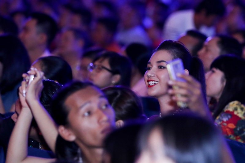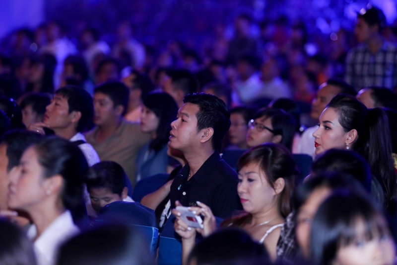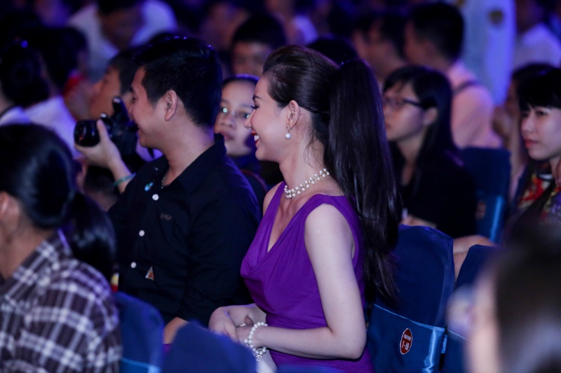 | Sân khấu đông kín và chỗ ngồi xa nên vợ chồng Quỳnh Chi phải rướn người lên xem các tiết mục. |