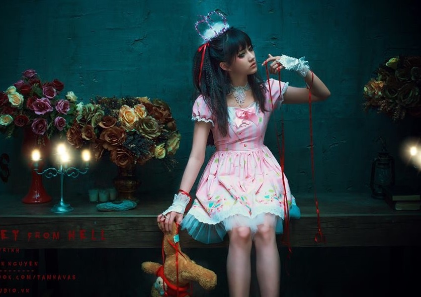Trong bộ ảnh mới, Kiều Trinh diện váy hồng, hóa trang thành búp bê ma, diễn xuất theo phong cách lạnh lùng, ma mị.