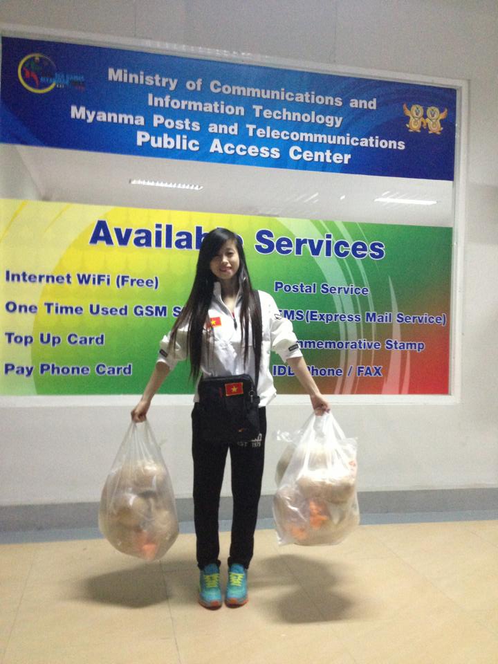 | Không chỉ mang về tấm HCV, Tuyết Vân còn mang rất nhiều quà Myanmar về cho người thân, đồng đội tại Việt Nam. |
