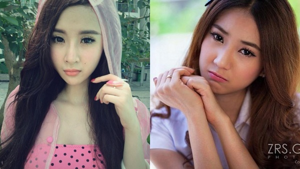 | Gương mặt Angela Phương Trinh khi trang điểm nhẹ nhàng trông không khác mấy so với Jade để mặt mộc. Cả hai đều có đôi mắt nhỏ, hơi xếch và đôi môi mỏng. |