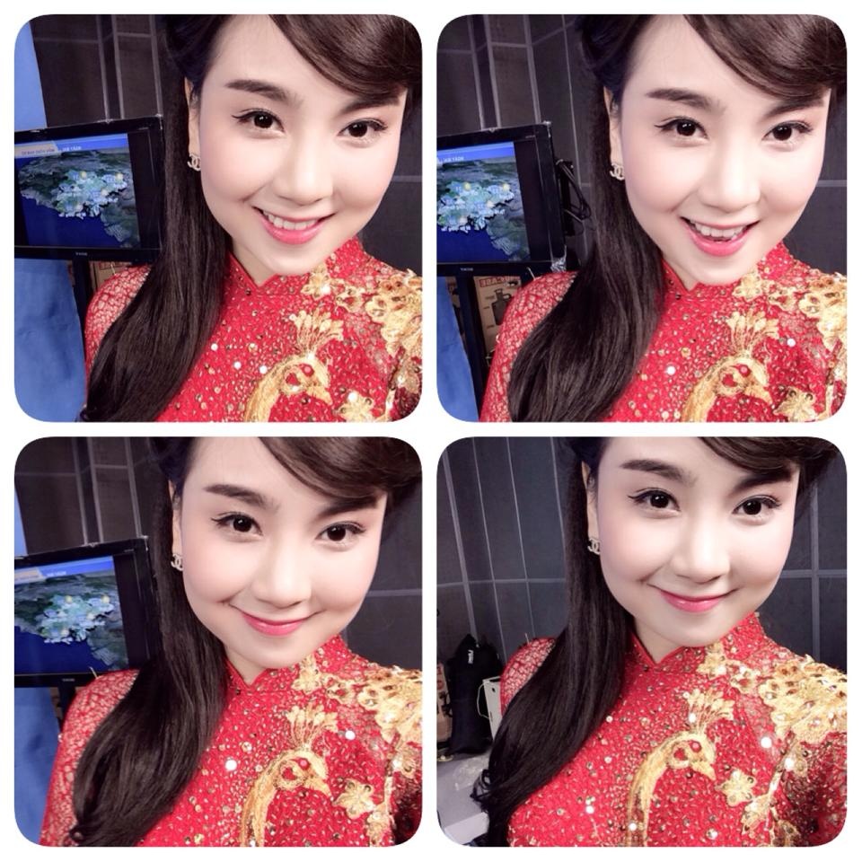 Mai Ngọc - cô gái xinh đẹp của Bản tin thời tiết trước lúc lên hình vào 19h đêm 30 Tết. |