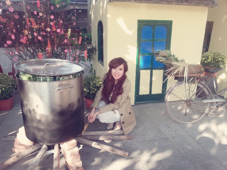 | Hot girl Hà Lade khoe phong cách thời trang cổ điển ngày Tết. Cô đã tự khâu tay cho mình chiếc túi hoa trong 3 ngày. |