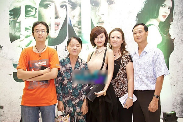 | Mi Du đưa cả gia đình đi xem phim. Cô tỏ ra là người chị lớn, trụ cột của gia đình với gương mặt đầy tự hào khi đứng cạnh những người thân yêu. Em trai Mi Du cũng rất điển trai và khá giống bố. Ảnh: Ngôi Sao. |