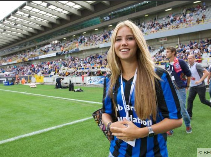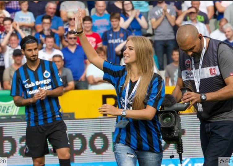 Axelle Despiegelaere - nữ cổ động viên xinh đẹp người Bỉ từng gây sốt trên hàng ghế khán giả cổ vũ World Cup 2014 - rạng rỡ xuất hiện trên SVĐ Jan Breydel ở Bruges, vinh dự đá trái bóng khai mạc trận đấu giữa Brugge và Lierse. |