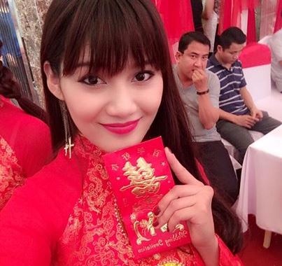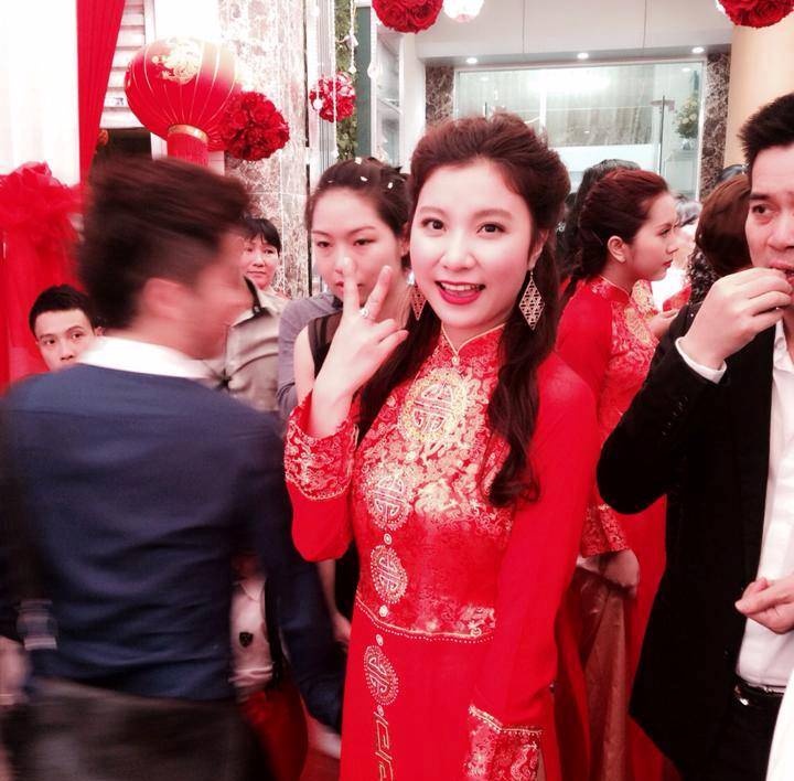| Hot girl Milan Phạm cũng tranh thủ khoe vẻ tươi tắn với đồng phục áo dài đỏ trong lễ ăn hỏi Thu Hương vừa qua. |