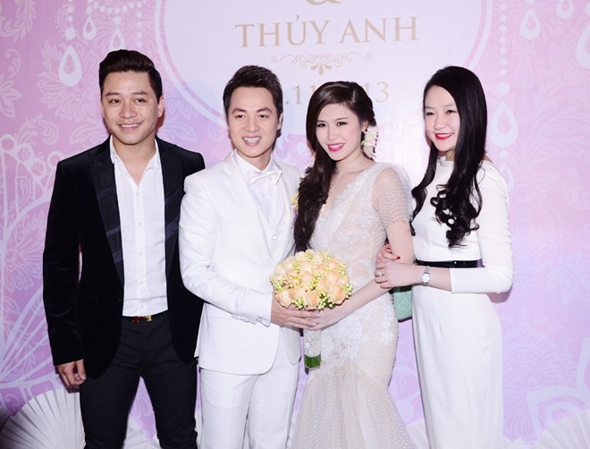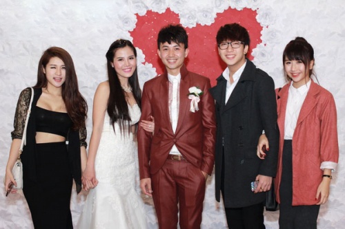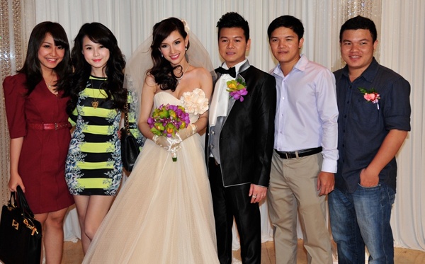 | Hot girl Hương Baby chọn chiếc váy màu trắng thanh lịch dự đám cưới Đăng Khôi, nhưng vô tình, áo váy của cô dâu chú rể đều tông trắng lên khi chụp ảnh kỷ niệm, hot girl trở lên lạc lỏng, kém nổi. Ảnh: Saoonline. |