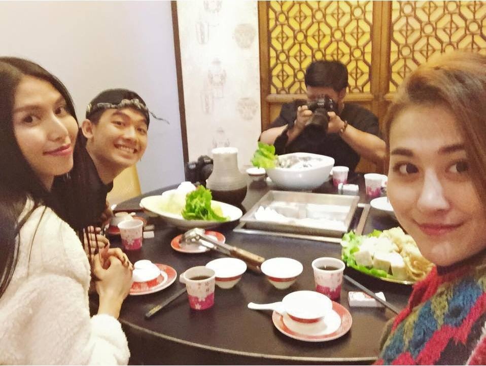 | Trưởng nhóm hài đình đám dùng bữa tối cùng hot girl Hà Lade và người mẫu Thùy Dương. Cả 3 đang có chuyến công tác cùng nhau tại xứ Đài. |