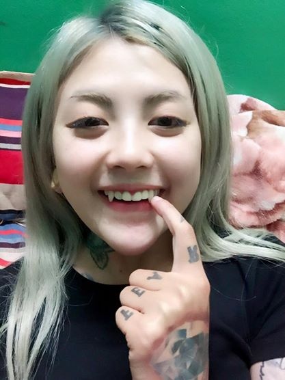| Nữ thợ xăm Hà thành Lee Zin (Bùi Kim Thanh) làm mặt xấu và khoe răng nanh giả. Cô là một trong số những gương mặt nổi bật của giới xăm nghệ thuật. |